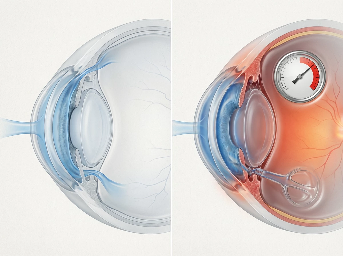 Čirá tekutina nacházející se uvnitř oka (tzv. nitrooční) je produkována řasnatým tělískem uloženým hned za oční duhovkou. Protéká skrze otvor v duhovce (zorničku) do přední komory oční, odkud oko opouští v místě, kde duhovka přiléhá k rohovce oka. Tekutina se v oku tvoří neustále a má také neustále odtékat. Většinou nejde o to, že by se jí vyrábělo moc, ale že se zhorší její odtok přes drenážní systém v místě, kde se potkává rohovka s duhovkou (komorový úhel). Jakmile systém přítok/odtok nefunguje dobře, může se tekutina uvnitř oka začít hromadit a postupně tak roste tlak v oku.