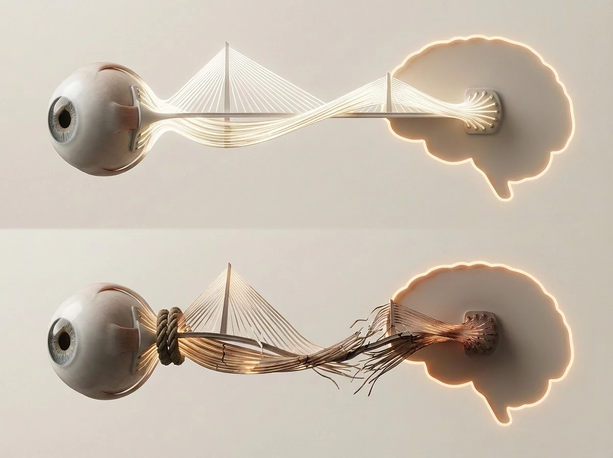 Zrakový nerv je svazek vláken, který podobně jako kabel přenáší informaci z oka do mozku. Je užitečné si ho představit jako most – pokud je dlouhodobě přetěžovaný (tlakem), nebo špatně „zásobený“ (krví), začnou se jednotlivá vlákna poškozovat. Most pak sice může ještě chvíli vydržet, ale jeho propustnost se zhoršuje, až se některé části přenosu přeruší.